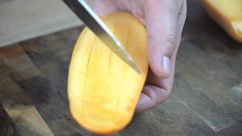 2.芒果對半切開再橫豎各劃數刀。